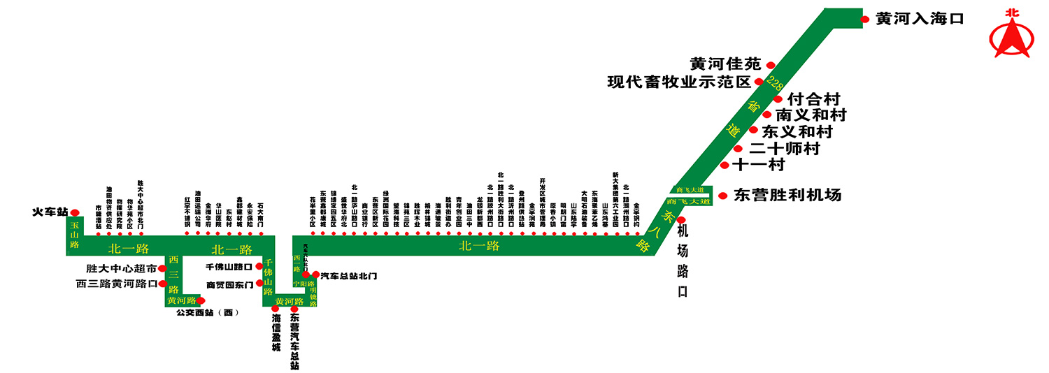 下行自公交西站始發(fā),經(jīng)黃河路、西三路、北一路、玉山路(火車站調(diào)頭)、北一路、千佛山路、黃河路、明鏡路、寧陽路、西一路、北一路、東八路、商飛大道(勝利機場調(diào)頭)、東八路、228省道、024鄉(xiāng)道到達終點站“黃河入海口”;上行按上述路線返回。